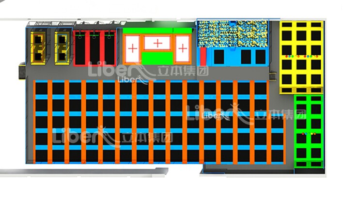 蹦床公园,根据不同的年龄可设计不同的功能区域,蹦床公园里可以有自由 弹跳、躲避球、蜘蛛塔、专业蹦床、灌篮、攀岩、忍者空间闯关 等20多种不同区域,这些区域可根据客人要求设计蹦床公园效果图