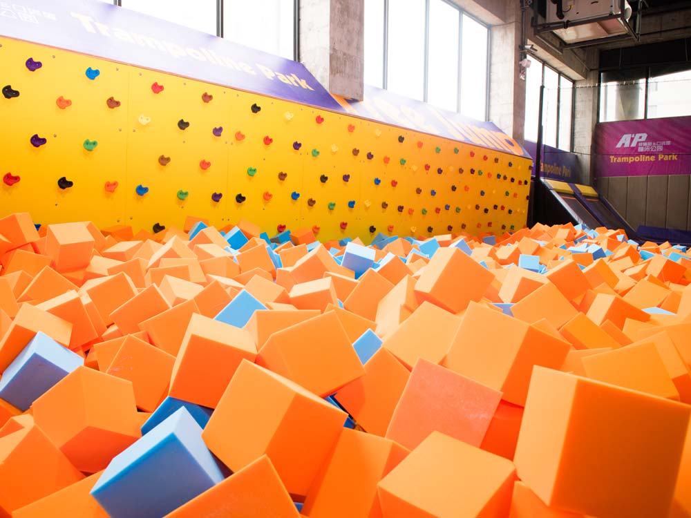 首先借助蹦面360度旋转空翻,掉落在柔软的海绵池里,再沿着凹凸不平的岩面往上爬,再次落到柔软的海绵池里,还可以站在不同高度的平台上,旋转、跳跃,闭着眼睛,尽情享受在空中翻转、旋转,完成各种炫酷动作,最后落到柔软的海绵池里,不但不危险,还很好玩,就算使出再大的力气,也不会伤到分毫;攀岩墙还可以做彩绘图案喔,趣味性更高