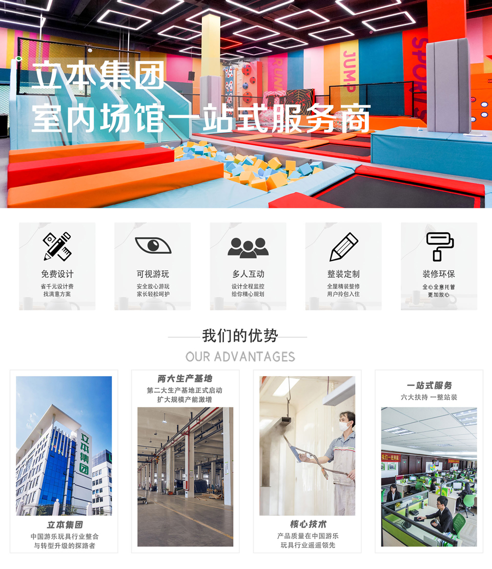蹦床公园是集成人、儿童为一体的综合性游乐场馆,立本集团可以根据场地情况以及定位的目标客户群体,把多个功能区域组合起来。利用各项游乐功能整合规划,将传统儿童室内乐园与成人游乐相结合,有效利用每一寸场地,打造火爆、好玩赚钱的新型游乐场所!